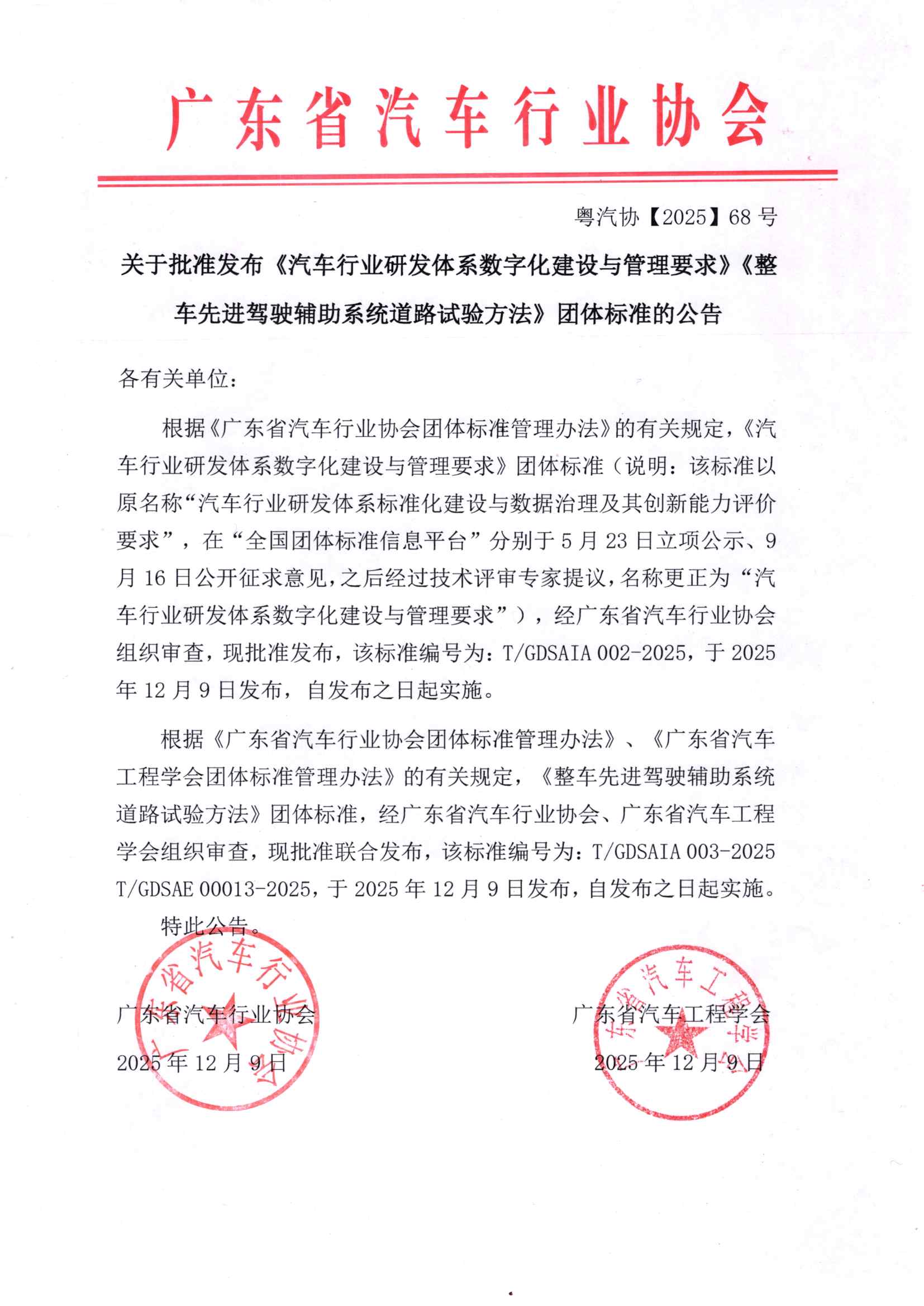 2025年12月9日,我協(xié)會在“全國團(tuán)體標(biāo)準(zhǔn)信息平臺”公開發(fā)布《汽車行業(yè)研發(fā)體系數(shù)字化建設(shè)與管理要求》、《整車先進(jìn)駕駛輔助系統(tǒng)道路試驗(yàn)方法》兩項團(tuán)體標(biāo)準(zhǔn),自發(fā)布之日起實(shí)施。
