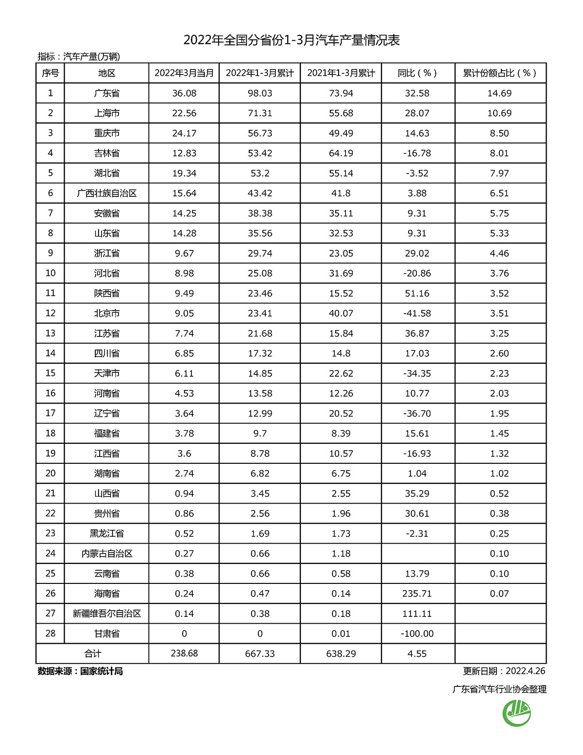2022年全國分省份1-3月汽車產量情況表