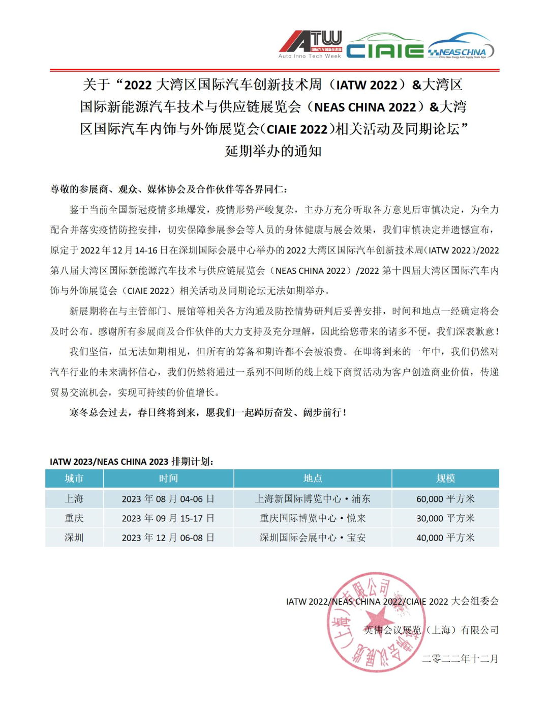 鑒于當前全國新冠疫情多地爆發,疫情形勢嚴峻復雜,主辦方充分聽取各方意見后審慎決定,為全力配合并落實疫情防控安排,切實保障參展參會等人員的身體健康與展會效果,我們審慎決定并遺憾宣布,原定于2022年12月14-16日在深圳國際會展中心舉辦的大灣區國際新能源汽車技術與供應鏈展覽會(NEAS CHINA 2022)相關活動及同期論壇無法如期舉辦。