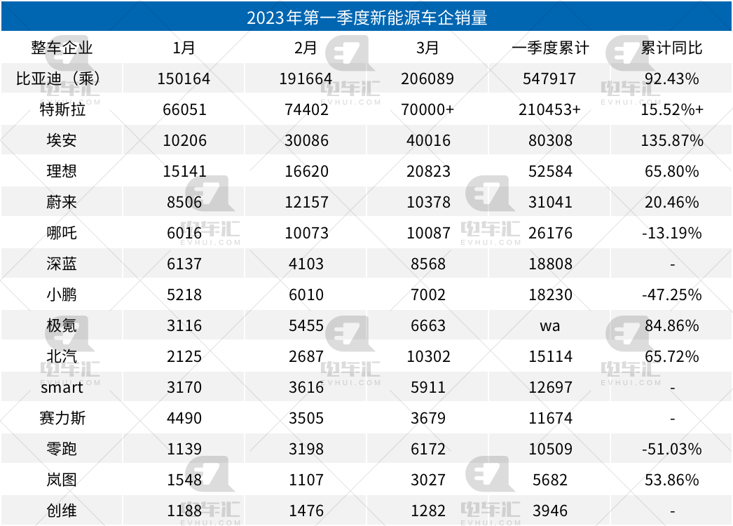 電車匯:隨著近期部分車企陸續(xù)公布3月份的銷量數(shù)據(jù),今年一季度的新能源汽車市場(chǎng)情況也基本明晰。從已經(jīng)公布銷量的車企來(lái)看,比亞迪以54.8萬(wàn)輛的數(shù)據(jù)穩(wěn)居首位,超過(guò)了其他公布了銷量車企的總和;埃安一季度銷量超8萬(wàn)輛,同比增長(zhǎng)最快;哪吒、小鵬、零跑銷量下滑。