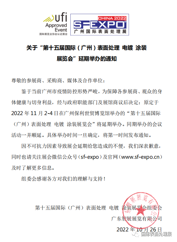 鑒于當前廣州市疫情防控形勢嚴峻,為保障各參展商、觀眾的身體健康與切身利益,經與政府職能部門及展館商議后決定:原定于2022年11月2-4日在廣州保利世貿博覽館舉辦的“第十五屆國際(廣州)表面處理 電鍍 涂裝展覽會”將延期舉辦。同期舉辦的會議活動一并順延。具體舉辦時間一旦確定,將第一時間發布通知。因不可抗力因素導致展會延期給您造成的不便,我們深表歉意,同時也請關注展會微信公眾號(sf-expo)及官網(www.sf-expo.cn)及時了解更多信息。