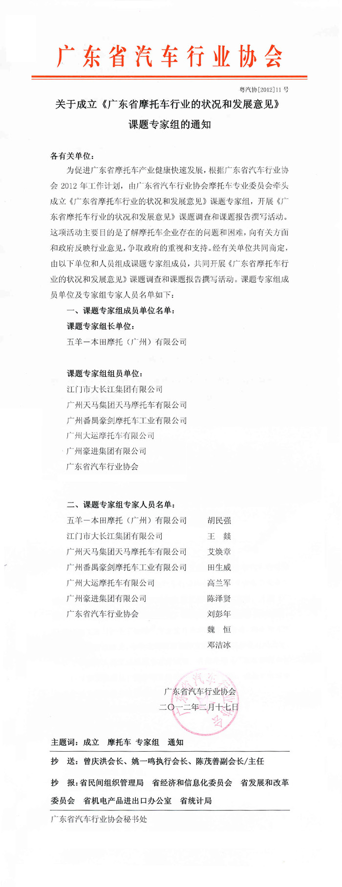 關于成立《廣東省摩托車行業的狀況和發展意見》課題專家組的通知
