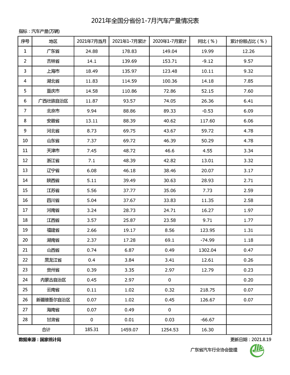 2021年全國分省份1-7月汽車產(chǎn)量情況表