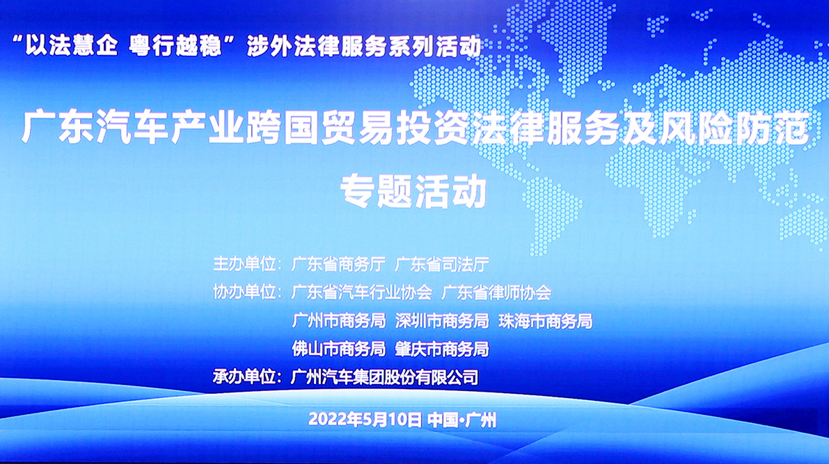 為統(tǒng)籌發(fā)展與安全,發(fā)揮法治對(duì)汽車產(chǎn)業(yè)發(fā)展的保障作用,推動(dòng)汽車企業(yè)境外安全、持續(xù)發(fā)展,廣東省商務(wù)廳聯(lián)合廣東省司法廳于2022年5月10日在廣汽中心舉辦了“廣東汽車產(chǎn)業(yè)跨國(guó)貿(mào)易投資法律服務(wù)及風(fēng)險(xiǎn)防范專題活動(dòng)”(以下簡(jiǎn)稱“汽車產(chǎn)業(yè)跨國(guó)投資法律服務(wù)”),廣東省汽車行業(yè)協(xié)會(huì)做為協(xié)辦單位參與了該項(xiàng)活動(dòng)。