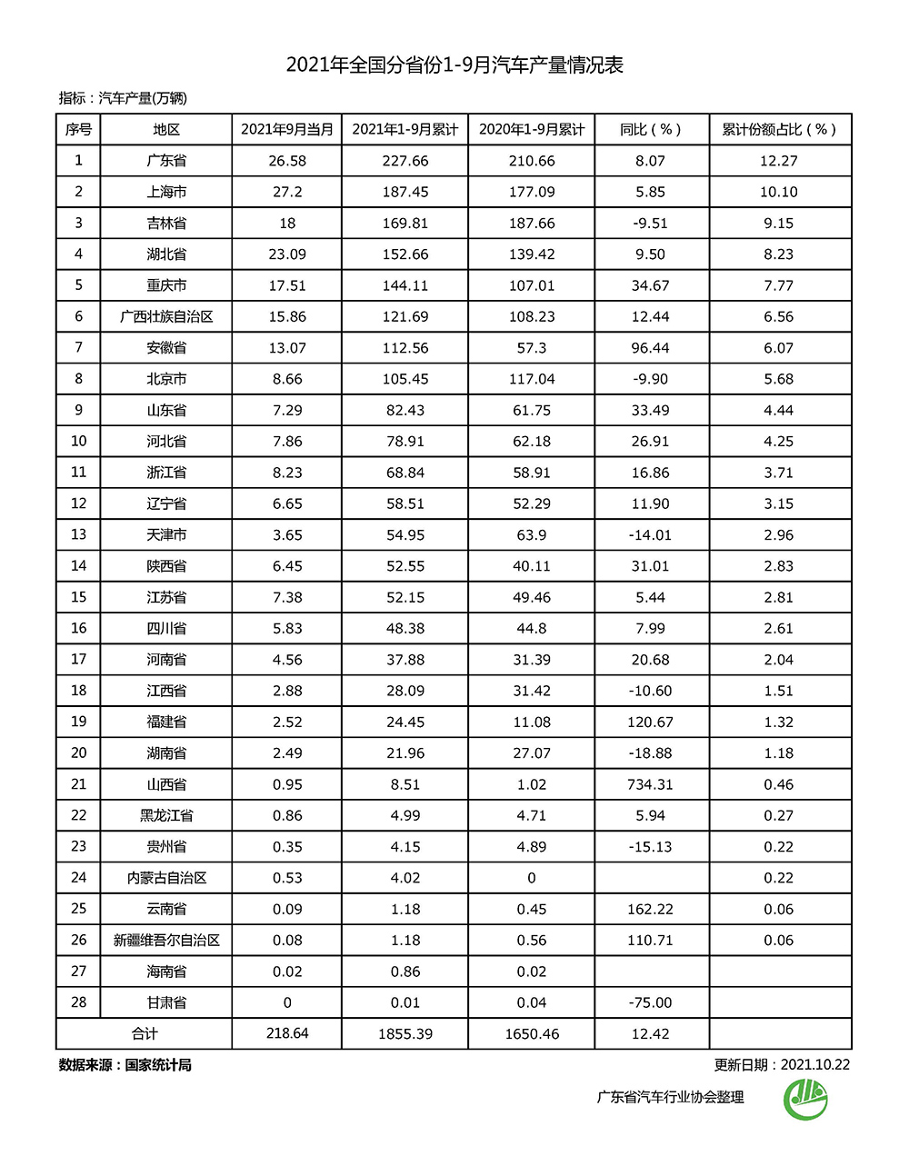 2021年全國分省份1-9月汽車產(chǎn)量情況表