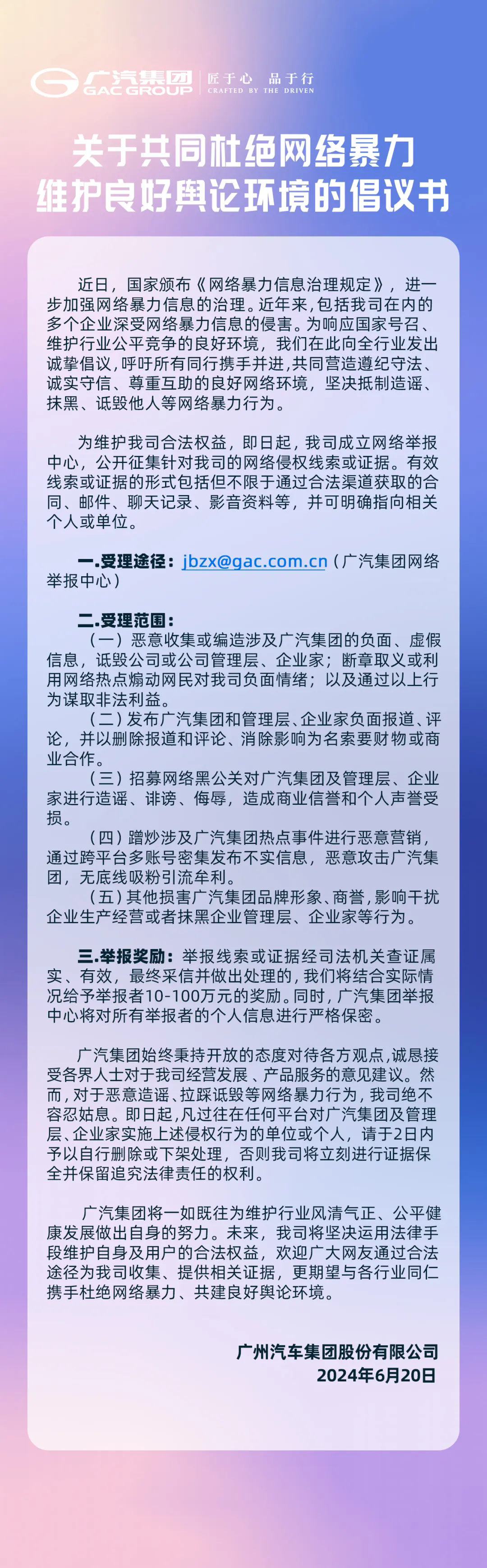 會長單位廣汽集團關于共同杜絕網絡暴力、維護良好輿論環境的倡議書