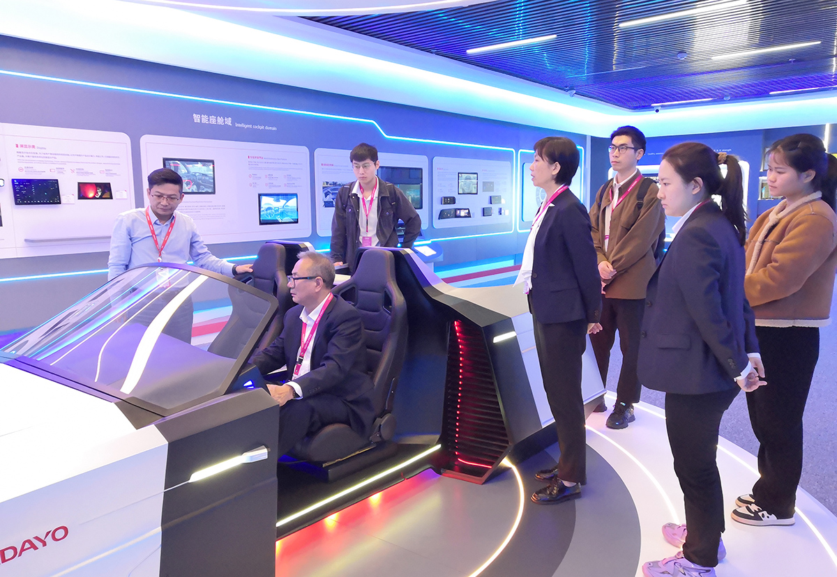 交流過程中,華陽通用李軍副總監介紹了公司概況和發展歷程,鐘秀媚部長也介紹協會主要服務內容及2024年重點工作計劃。在陳振佳副經理在陪同下,協會一行參觀了公司產品展廳,了解華陽通用智能座艙域與智能駕駛域產品研發和應用情況。