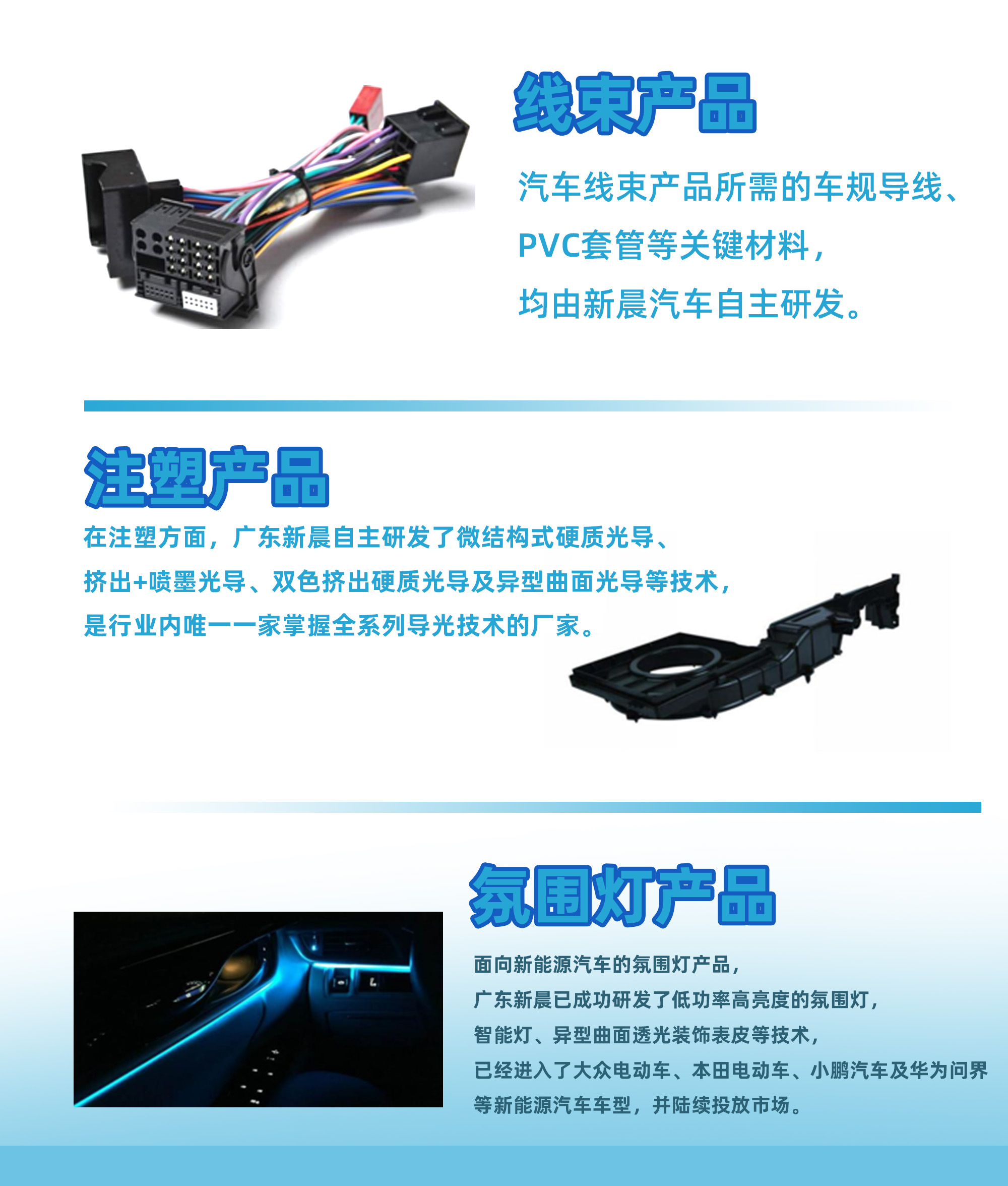 公司成立于2005年,現(xiàn)擁有中山、上海、武漢、成都等生產(chǎn)基地及廣州總部研發(fā)基地,并先后與北京理工大學(xué)、上海同濟(jì)大學(xué)等高校科研院所開(kāi)展產(chǎn)學(xué)研合作,致力于汽車光學(xué)、汽車電子等方向的研發(fā)。廣東新晨亦是第一家為一汽大眾開(kāi)發(fā)氛圍燈的國(guó)內(nèi)民營(yíng)企業(yè),在汽車氛圍燈領(lǐng)域,廣東新晨處于行業(yè)領(lǐng)航者地位,且公司目前已進(jìn)入上市流程。