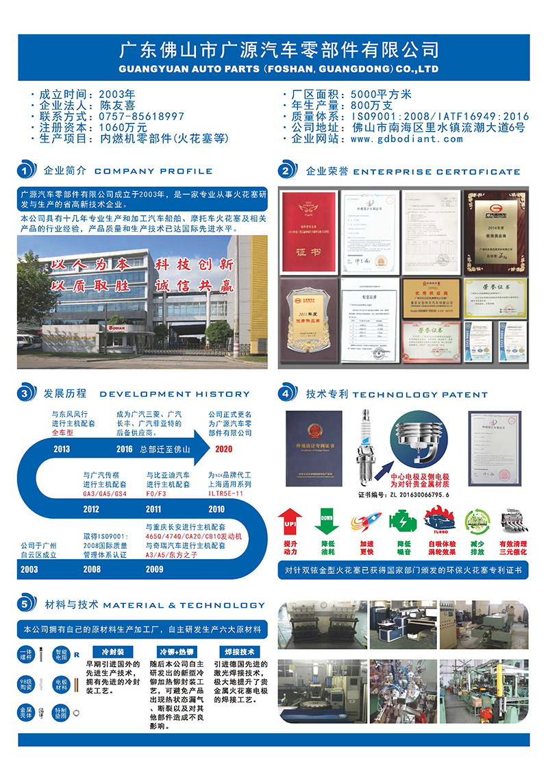 李景漢總經理介紹公司生產的火花塞類型齊全:以對針雙銥金型、銥鉑金型、銥金型,鉑金型火花塞為主體,同時還有鎳包銅電阻型、油氣兩用型等火花塞產品。如今本公司旗下擁有多個自主品牌,如“博電BODIAN”、“廣源 GUANGYUAN”、“機精 JJ”等。