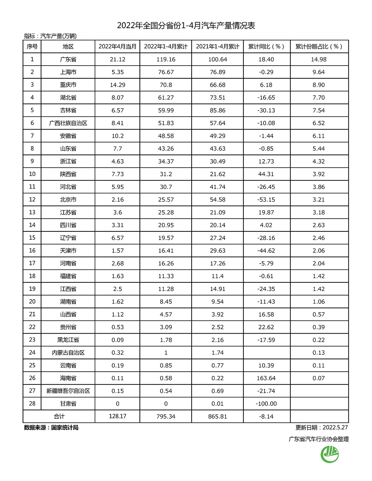 2022年全國分省份1-4月汽車產(chǎn)量情況表